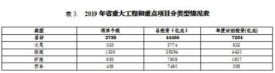 2019年共安排省重大工程和重點項目2738個,總投資44466億元,2019年計劃投資7204億元。其中:收尾項目323個,總投資3774億元,年度計劃投資822億元;續(xù)建項目1326個,總投資25294億元,年度計劃投資4420億元;新建項目653個,總投資7908億元,年度計劃投資1607億元;預(yù)備項目436個,總投資7490億元,年度計劃投資355億元。