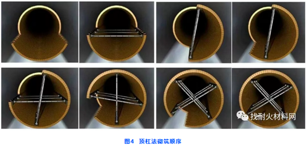 頂杠法適用于直徑小于4m的回轉(zhuǎn)窯,砌筑順序如圖4所示,從回轉(zhuǎn)窯底部開始向兩側(cè)砌筑,在回轉(zhuǎn)窯中心線部位用螺旋頂杠和木方壓實固定耐火磚,耐火磚砌筑時始終處于中心線以下,會因為自身的重力緊貼在回轉(zhuǎn)窯窯體內(nèi)壁:因為在砌筑時需要頻繁轉(zhuǎn)窯,所以頂杠法比較適用于直徑小于4m的窯體。