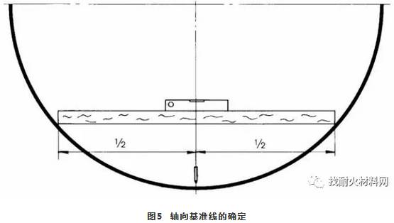 可以防止砌筑時磚環(huán)砌歪和磚列扭曲,同時可以控制耐火磚的磚縫厚度。首先確定軸向基準(zhǔn)線,可以采用水平儀、直尺和鉛錘確定,如圖5所示,軸向基準(zhǔn)線每隔1.5m畫一條,每條與窯的中心線平行;環(huán)向基準(zhǔn)線每隔1m畫一條,每條與窯的中心線垂直;