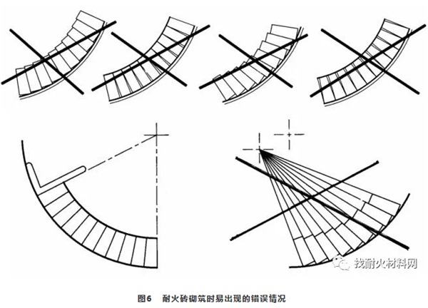 (3)砌筑時需保證耐火磚貼緊窯體內(nèi)壁,各耐火磚側(cè)面之間(環(huán)向)相互貼緊,隨時用橡皮錘或木錘敲擊找正來保證這兩項貼緊;不時檢查各環(huán)縫是否與環(huán)向基準(zhǔn)線平行,耐火磚的徑向方向線是否與窯體同心,各環(huán)耐火磚間不能存在“臺階”現(xiàn)象,磚縫不能出現(xiàn)楔形磚縫,如圖6所示: