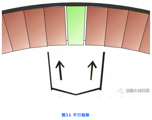 (7)使用鎖磚和鋼板鎖口時需注意,布置好鎖磚和標(biāo)準(zhǔn)磚后,注意觀察磚縫,若磚縫是水平,則在標(biāo)準(zhǔn)磚側(cè)面打入鋼板,不得在鎖磚側(cè)面打入鋼板,如圖11所示:若磚縫是楔型的,此時打入鋼板會導(dǎo)致耐火磚會出現(xiàn)應(yīng)力集中損壞,需要返工,如圖12所示: