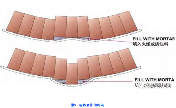 在窯體變形處砌筑時,由于耐火磚不能于窯體貼緊,用耐火泥漿找平后進(jìn)行砌筑,軸向歪斜的耐火磚側(cè)面不能貼緊,采用耐火泥漿成陶瓷纖維板來調(diào)增,如圖9、10所示: