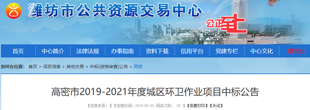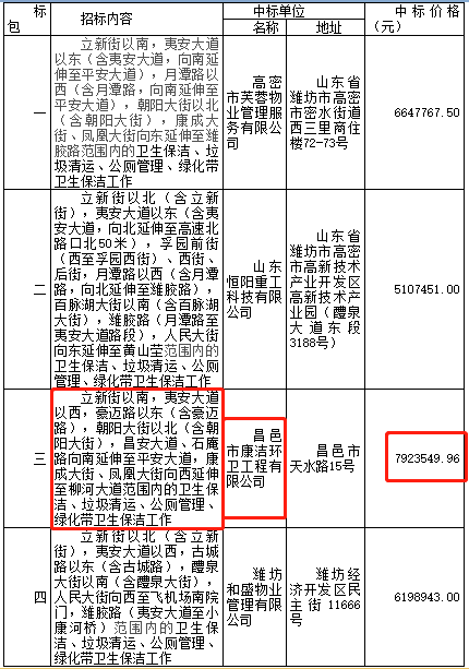 山東濰坊高密市2019-2021年度城區(qū)環(huán)衛(wèi)作業(yè)項目發(fā)布中標(biāo)公告,昌邑市康潔環(huán)衛(wèi)工程有限公司獲得三標(biāo)段,中標(biāo)金額792萬。