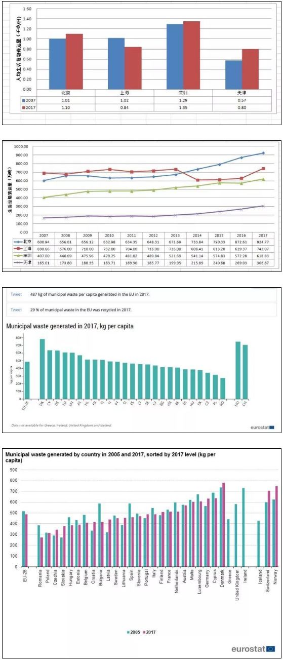 人均生活垃圾量是多是少,如何評(píng)價(jià)。有人說少好,少說明減量化做的好??礆W盟28個(gè)國家生活垃圾量統(tǒng)計(jì),人均量多的國家往往生活垃圾管理水平高,生活垃圾回收利用利用率也高,如2017年歐洲生活垃圾量統(tǒng)計(jì)數(shù)據(jù):丹麥748千克/人·年,瑞士706千克/人·年,德國633千克/人·年;人均生活垃圾量少的國家往往經(jīng)濟(jì)水平低,生活垃圾回收率低,如羅馬尼亞272千克/人·年,塞爾維亞306千克/人·年;2017年瑞士生活垃圾回收利用率為53%,丹麥為48%,而羅馬尼亞只有13%。
