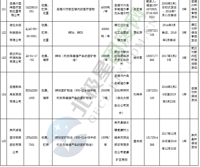日前湖北省生態(tài)環(huán)境廳發(fā)布了《湖北省危險(xiǎn)廢物經(jīng)營許可證》單位名錄(截至2019年2月19日,共125家)。
