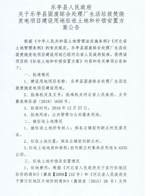 日前河北樂亭縣生活垃圾焚燒發(fā)電項目征收土地和補(bǔ)償安置方案公告公示,具體內(nèi)容如下: