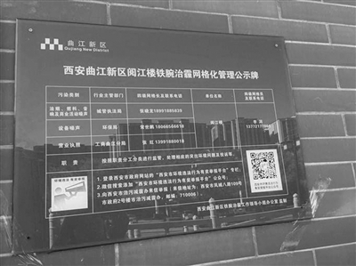 西安曲江新區(qū)閱江樓酒店門(mén)口的鐵腕治霾網(wǎng)格化管理公示牌,二維碼方便市民監(jiān)管和舉報(bào) 。