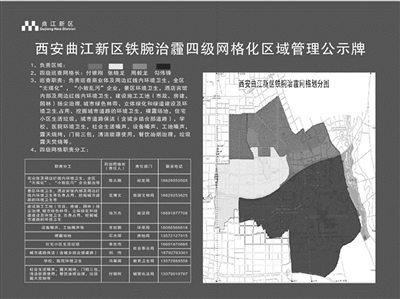 ?西安曲江新區(qū)鐵腕治霾四級(jí)網(wǎng)格化區(qū)域管理公示牌。