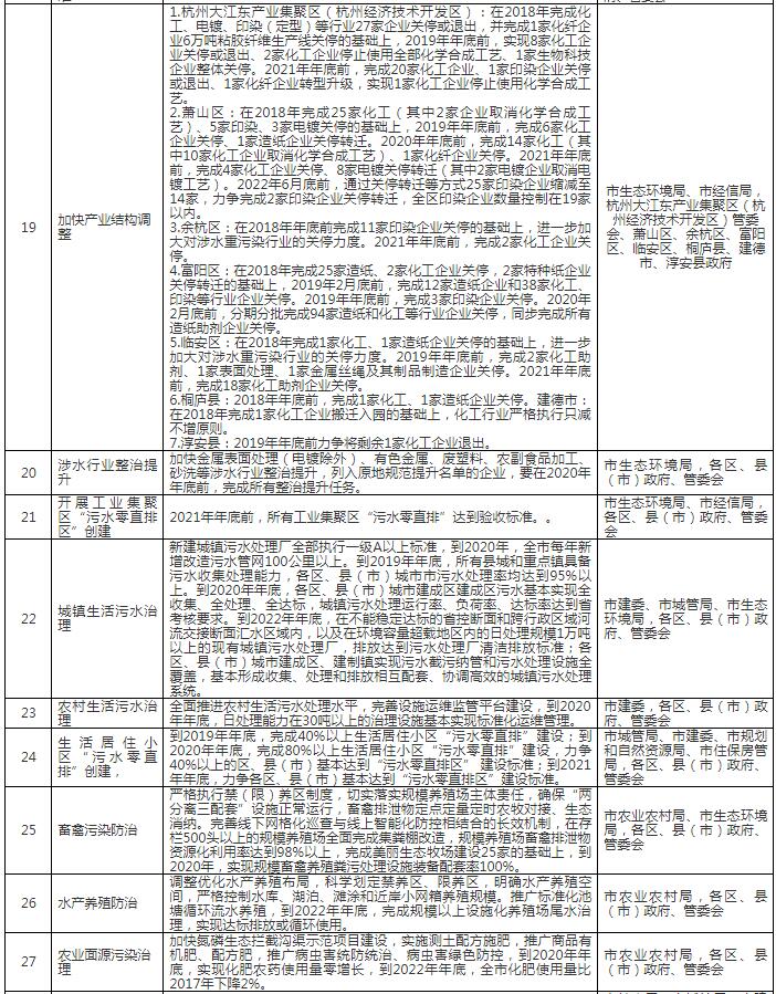 2.強(qiáng)化工業(yè)污染治理。制定涉水重污染行業(yè)“杭州標(biāo)準(zhǔn)”,到2020年,完成化工、印染、造紙等涉水重污染行業(yè)地方排放標(biāo)準(zhǔn)的制定。結(jié)合傳統(tǒng)產(chǎn)業(yè)改造提升行動(dòng),加快錢(qián)塘江流域化工、印染、造紙等企業(yè)或產(chǎn)能的搬遷改造,到2022年完成369家企業(yè)關(guān)停轉(zhuǎn)遷。加快金屬表面處理(電鍍除外)、有色金屬、廢塑料、農(nóng)副食品加工、砂洗等涉水行業(yè)整治提升,列入原地規(guī)范提升名單的企業(yè),要在2020年年底前完成所有整治提升任務(wù)。開(kāi)展工業(yè)集聚區(qū)“污水零直排區(qū)”創(chuàng)建,2021年年底前,所有工業(yè)集聚區(qū)“污水零直排”達(dá)到驗(yàn)收標(biāo)準(zhǔn)。加快建立工業(yè)集聚區(qū)截污納管、雨污分流、排水許可證發(fā)放等管理的“一園一檔”。在全面完成重點(diǎn)排污單位自動(dòng)監(jiān)控設(shè)施安裝和聯(lián)網(wǎng)的基礎(chǔ)上,加強(qiáng)自動(dòng)監(jiān)控設(shè)施運(yùn)行管理,進(jìn)一步強(qiáng)化監(jiān)督執(zhí)法。
