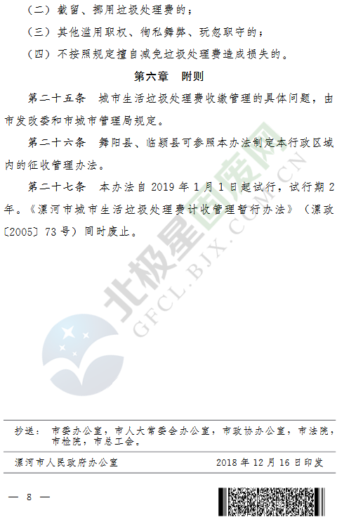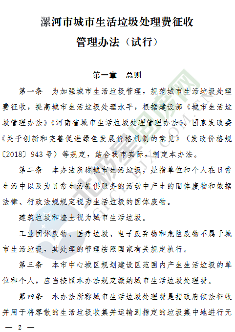 日前,《漯河市城市生活垃圾處理費征收管理辦法(試行)》已經(jīng)河南漯河市政府第36次常務會議研究通過,并于2019年1月1日起試行?!朵鸷邮谐鞘猩罾幚碣M征收管理辦法(試行)》是對《漯河市城市生活垃圾處理費計收管理暫行辦法》(漯政〔2005〕73號)的完善修訂。