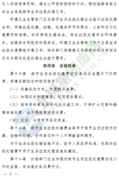 答:國家建設部《城市生活垃圾管理辦法》及《河南省城市生活垃圾處理管理辦法》中規(guī)定:國家對城市生活垃圾的清掃、收集、運輸和處理服務實行收費制度。
