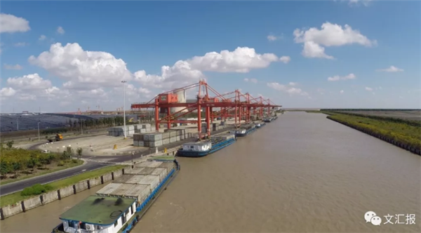 細(xì)雨蒙蒙,車駛?cè)肷虾@细凵鷳B(tài)環(huán)?;?。兩側(cè)樹(shù)木成林,草坪成片。生態(tài)苑里,“烏篷聽(tīng)雨”“蘆花鷺影”景致別樣,儼然一座郊野公園。不遠(yuǎn)處,白色的風(fēng)力發(fā)電機(jī),在高空中緩緩轉(zhuǎn)動(dòng)3支葉片。不時(shí)有運(yùn)輸集卡從身邊駛過(guò)。
