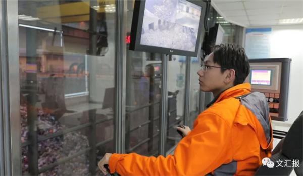 很快,就到了老港再生能源中心。每天有超過(guò)3000噸生活垃圾在這里的焚燒廠分解、發(fā)電,變廢為寶。在垃圾待焚燒庫(kù)區(qū), 6個(gè)爪子的機(jī)器抓手,像抓娃娃機(jī)一樣,強(qiáng)有力地一把抓起垃圾,靈活地送入焚燒口。這個(gè)巨大的抓手,一次可以抓送8噸垃圾。