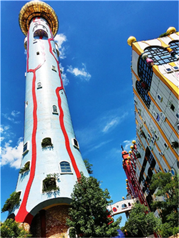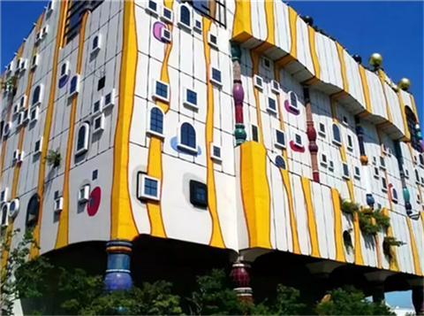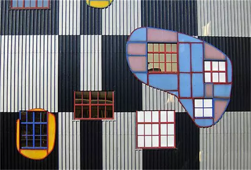 鮮艷的色塊斑斕無比,建筑再也不會“冷冰冰”;紅色與黃色的條紋象征著處理廠的火焰;五百多個(gè)形狀各異的窗戶裝飾著墻壁……這里就是一個(gè)按照百水先生世界觀建造的奇幻之地。