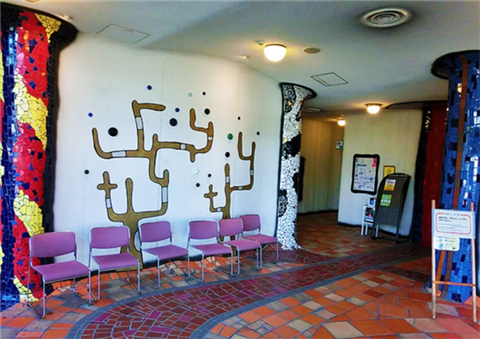 煙囪雖然有點(diǎn)“遺憾”,但在其他地方,你依舊能感受到百水先生飽滿豐盈的想象力和那顆炙熱的童心:入口處的爬墻虎和各種植被環(huán)繞的樣子,很容易令人想到三鷹的吉卜力美術(shù)館;