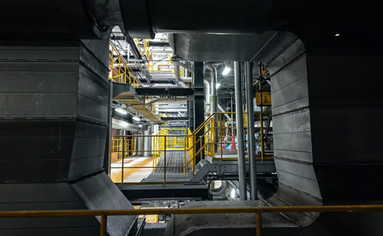 為了不讓這些臭氣泄露到室外,在這個(gè)巨型儲池的頂部安裝了強(qiáng)力抽風(fēng)機(jī),把臭氣收集起來后,再經(jīng)過預(yù)熱程序,最終通過專門的管道送往焚燒爐的底部,作為燃燒用的空氣再利用,這樣既解決了臭氣外泄的問題,又解決了燃燒用空氣的問題,是實(shí)實(shí)在在的“一舉兩得”。