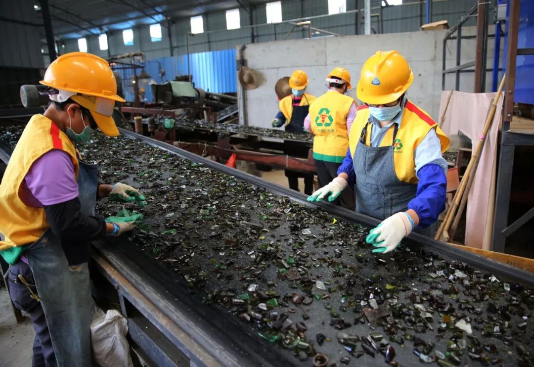 △白云區(qū)玻璃回收處理中心:回收的廢棄玻璃制品通過(guò)機(jī)器進(jìn)行破碎清洗后,工作人員在進(jìn)行精細(xì)分揀工序,將金屬蓋、塑料蓋徹底分離出來(lái)
