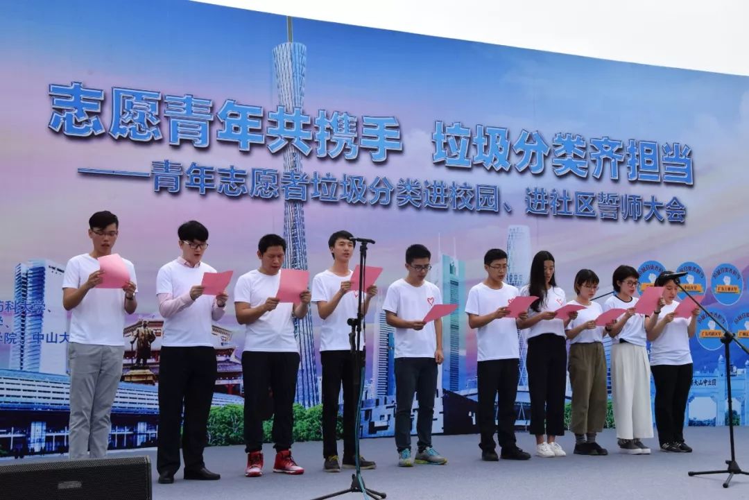 △2017年5月6日,廣州市番禺區(qū)大學(xué)城中心湖公園召開(kāi)“志愿青年共攜手,垃圾分類(lèi)齊擔(dān)當(dāng)”為主題的青年志愿者垃圾分類(lèi)進(jìn)校園、進(jìn)社區(qū)誓師大會(huì),大學(xué)生宣誓現(xiàn)場(chǎng) 。