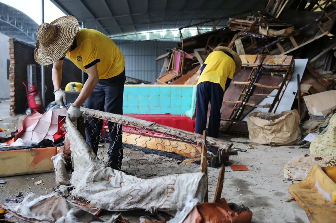 △城管委帶隊(duì)督查花都區(qū)垃圾分類(lèi)成效,供銷(xiāo)社垃圾分類(lèi)點(diǎn),工作人員在將回收回來(lái)的低附加值廢棄家具進(jìn)行破拆,分類(lèi)成木材、布料、海綿等經(jīng)行回收。圖為工作人員在破拆一張沙發(fā)