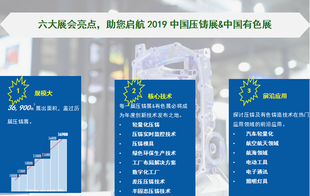 中國壓鑄展和中國有色展力爭(zhēng)走在行業(yè)前沿,通過展品及現(xiàn)場(chǎng)10多場(chǎng)專題論壇,發(fā)布并展示壓鑄生產(chǎn)工藝中,具有創(chuàng)新性、行業(yè)關(guān)注的熱點(diǎn)解決方案:結(jié)構(gòu)件壓鑄技術(shù)、綠色環(huán)保生產(chǎn)技術(shù)、智能制造方案、數(shù)字化工廠、數(shù)控機(jī)床、半固態(tài)壓鑄技術(shù)、鎂合金鑄件技術(shù)等話題,優(yōu)化工藝流程,提高能源利用效率。