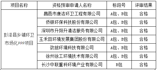 江西省彭澤縣鄉(xiāng)鎮(zhèn)環(huán)衛(wèi)市場化PPP項目發(fā)布中標(biāo)公示,昌邑市康潔環(huán)衛(wèi)工程有限公司獲A包(東區(qū)),初始年政府付費1065.82萬元;勁旅環(huán)境科技有限公司獲B包(西區(qū)),初始年政府付費1053.61萬元。