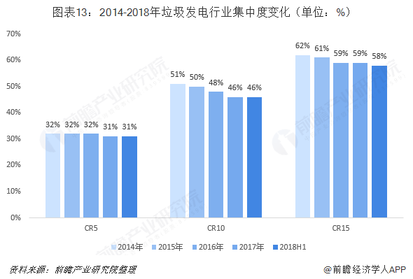 從行業(yè)整體來看,我國垃圾發(fā)電行業(yè)集中度較高,不過近年來趨于下滑。從存量已投運產(chǎn)能市占率看,CR5在2014年-2018H1基本維持在31%-32%,CR10由2014年的51%下降至2018H1的46%,CR15由2014年的51%下降至2018H1的46%。