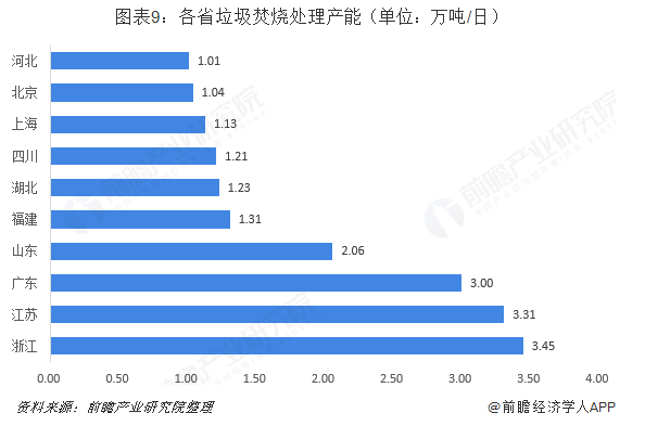 目前,國內(nèi)的垃圾焚燒發(fā)電廠主要分布在經(jīng)濟發(fā)達地區(qū)和一些大城市。從垃圾焚燒產(chǎn)能角度看,浙江、江蘇、廣東三省垃圾焚燒產(chǎn)能超過3萬噸/日,其中浙江省生活垃圾焚燒發(fā)電廠數(shù)量最多,垃圾焚燒處理產(chǎn)能最大。