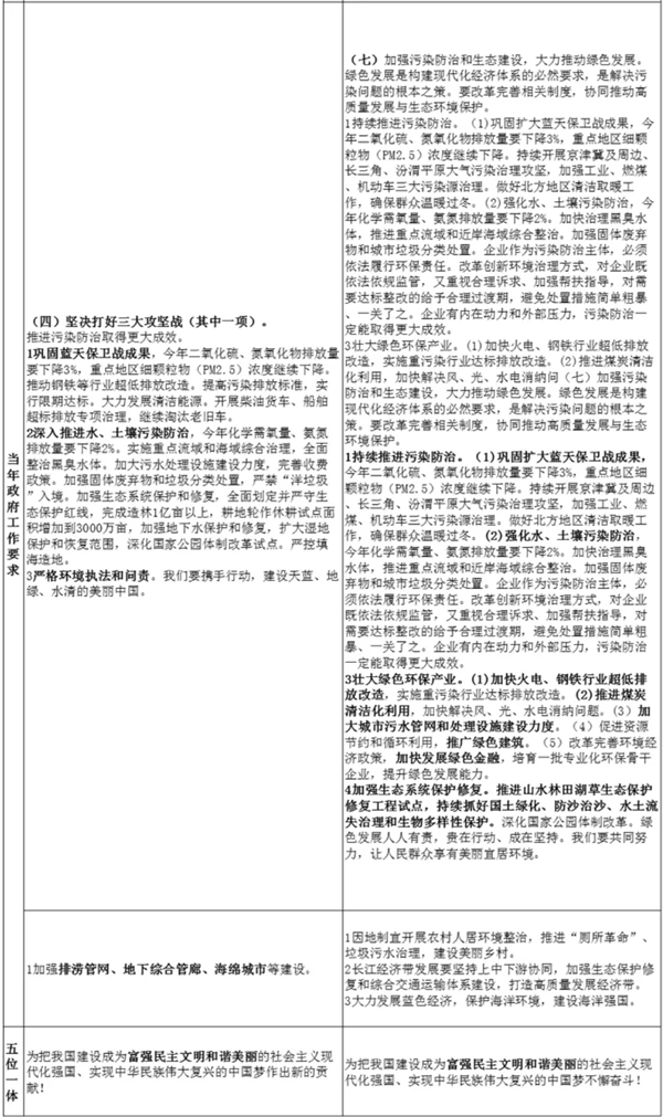 原文:“持續(xù)推進(jìn)污染防治。鞏固擴(kuò)大藍(lán)天保衛(wèi)戰(zhàn)成果,今年二氧化硫、氮氧化物排放量要下降3%,重點(diǎn)地區(qū)細(xì)顆粒物(PM2.5)濃度繼續(xù)下降。持續(xù)開(kāi)展京津冀及周邊、長(zhǎng)三角、汾渭平原大氣污染治理攻堅(jiān),加強(qiáng)工業(yè)、燃煤、機(jī)動(dòng)車三大污染源治理。做好北方地區(qū)清潔取暖工作,確保群眾溫暖過(guò)冬。強(qiáng)化水、土壤污染防治,今年化學(xué)需氧量、氨氮排放量要下降2%。加快治理黑臭水體,推進(jìn)重點(diǎn)流域和近岸海域綜合整治。加強(qiáng)固體廢棄物和城市垃圾分類處置。企業(yè)作為污染防治主體,必須依法履行環(huán)保責(zé)任。改革創(chuàng)新環(huán)境治理方式,對(duì)企業(yè)既依法依規(guī)監(jiān)管,又重視合理訴求、加強(qiáng)幫扶指導(dǎo),對(duì)需要達(dá)標(biāo)整改的給予合理過(guò)渡期,避免處置措施簡(jiǎn)單粗暴、一關(guān)了之。企業(yè)有內(nèi)在動(dòng)力和外部壓力,污染防治一定能取得更大成效。”