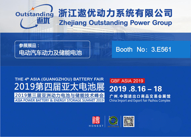 浙江遨優(yōu)動(dòng)力系統(tǒng)有限公司以144平米展位重磅出席2019年8月16-18日在廣州.廣交會(huì)展館A區(qū)舉辦的GBF.ASIA 2019第四屆亞太電池展!