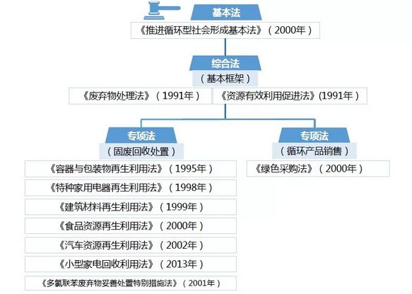 日本自2000年開始,推行《推進(jìn)循環(huán)型社會基本法》,提出了建立循環(huán)型社會的目標(biāo)。針對廢棄物處理提出了減量控制(reduce)、回收利用(reuse)和循環(huán)再利用(recycle)的“ 3R”原則。先后頒布實(shí)施了多部法律,包括《推進(jìn)循環(huán)型社會形成基本法》,以及《廢棄物管理和公共清潔法》、《促進(jìn)資源有效利用法》、《容器和包裝物回收利用法》、《家用電器回收再利用法》、《食品回收再利用法》、《建筑及材料回收法》等專項(xiàng)法規(guī)。