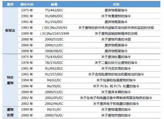 歐盟通過廢棄物框架指令確立了固廢處理的理念,建立了固廢處理體系,其相關(guān)的環(huán)境法律政策實(shí)際由兩部分組成,一部分是各類指令,從法律上直接對各成員國起約束作用,另一部分是定期頒布的環(huán)境行動(dòng)規(guī)劃,對各成員國進(jìn)行目標(biāo)、內(nèi)容上的指導(dǎo)。