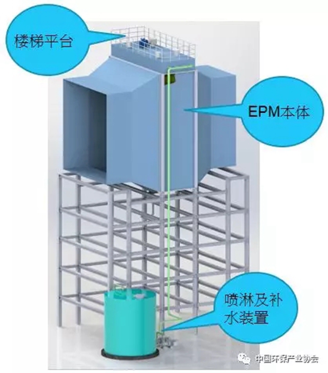 電風(fēng)攔截系統(tǒng)主要由本體、噴淋系統(tǒng)及相應(yīng)的樓梯平臺等組成,本體包括了氣流分布裝置、預(yù)荷電格柵、陰陽極、殼體、高壓電源及控制系統(tǒng)等。具體如下圖所示:
