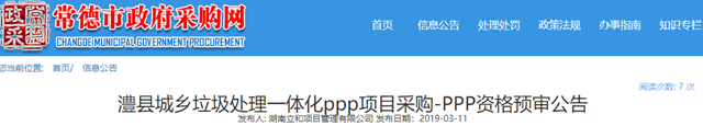 2019年3月11日,湖南常德澧縣城鄉(xiāng)垃圾處理一體化PPP項目發(fā)布資格預(yù)審公告。