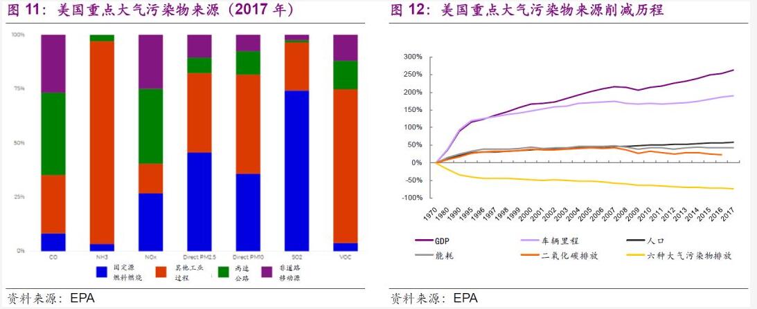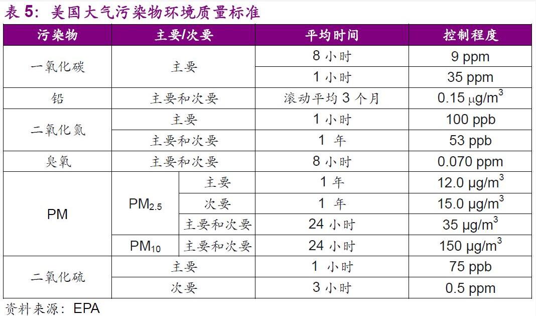 綜上所述,美國(guó)的大氣環(huán)保治理隨污染(洛杉磯煙霧、多諾拉事件)而起,通過(guò)一系列法律法規(guī)的修訂、全方面污染源的控制、以及特有的排污權(quán)交易體系的建立,較為成功的實(shí)現(xiàn)了空氣環(huán)境的治理和顯著改善。在政策和監(jiān)管的雙重壓力下,美國(guó)的排污企業(yè)(電廠、鋼企等)多通過(guò)自行研發(fā)并安裝脫硫脫硝設(shè)施和優(yōu)化生產(chǎn)技術(shù)的方式實(shí)現(xiàn)清潔排放,故美國(guó)并沒(méi)有大型的專(zhuān)精于脫硫脫硝技術(shù)的大氣環(huán)保類(lèi)公司。目前,大氣治理行業(yè)在美國(guó)的關(guān)注度和市場(chǎng)均處于低位,這與美國(guó)目前的工業(yè)企業(yè)產(chǎn)能總量、布局、以及技術(shù)的先進(jìn)程度有著很大關(guān)系,美國(guó)大氣治理行業(yè)目前的側(cè)重點(diǎn)在室內(nèi)空氣污染技術(shù)優(yōu)化和設(shè)備創(chuàng)新上,相關(guān)公司也多為小型的專(zhuān)注于室內(nèi)空氣污染解決方案和設(shè)備銷(xiāo)售的公司。
