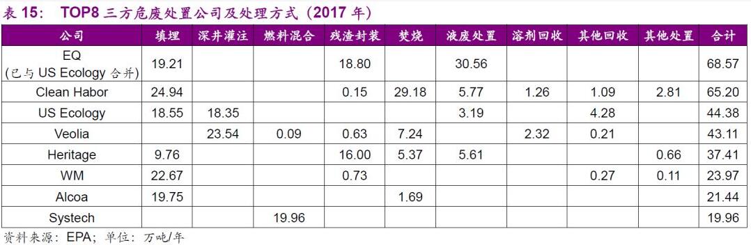 (2)第三方處理比例較低。在1990年后,政府對(duì)危廢的監(jiān)管進(jìn)一步趨嚴(yán),單純的通過(guò)第三方處置對(duì)于有大量危廢產(chǎn)出的企業(yè)來(lái)說(shuō)成本過(guò)高,加上危廢處理技術(shù)的進(jìn)一步成熟,促使眾多大型化工企業(yè)采用自行處理危廢的方式消納危廢產(chǎn)出。從2001年起,美國(guó)危廢的場(chǎng)外處理量(Waste received from off-Site,即接收從場(chǎng)外運(yùn)送進(jìn)處理廠內(nèi)的危廢,基本等同于第三方處置量)常年低于20%,在危廢產(chǎn)量基本穩(wěn)定的情況下,第三方處置危廢企業(yè)可以分到的蛋糕其實(shí)十分有限,這也激發(fā)了危廢處置企業(yè)開(kāi)拓新業(yè)務(wù)的需求。