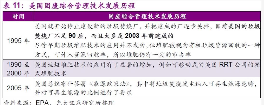 成熟技術(shù)為固廢綜合管理發(fā)展提供有力支撐。固廢行業(yè)的技術(shù)發(fā)展同樣是制約市場(chǎng)和公司發(fā)展的另一個(gè)決定性因素。早在1940年,美國(guó)公共衛(wèi)生署(USPHS)便開(kāi)始推行了一系列固廢處置的技術(shù)性試驗(yàn),從“衛(wèi)生填埋代替露天堆放”,到“垃圾堆肥的探索和試驗(yàn)”,再到“垃圾焚燒”,最后到了如今大力推廣的“廢物能源回收”的綜合利用。