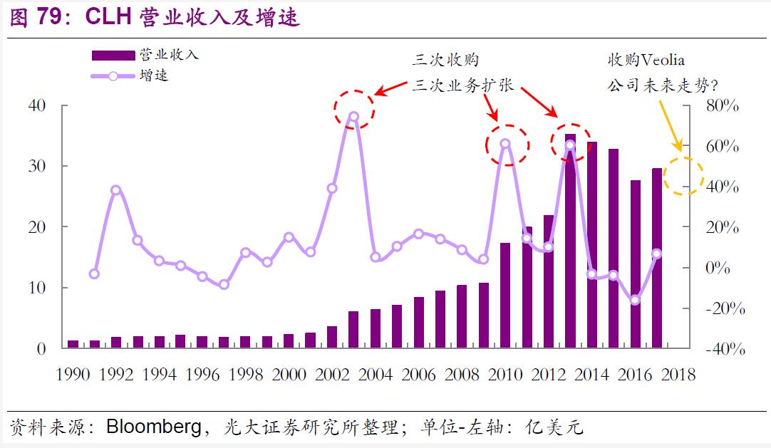 公司在成立后的近40年里,通過(guò)大大小小近40余次外延并購(gòu),在增加危險(xiǎn)廢物處理設(shè)施的數(shù)量和覆蓋區(qū)域、擴(kuò)大業(yè)務(wù)服務(wù)范圍的同時(shí),也致力于增添新的涵蓋多個(gè)行業(yè)和業(yè)務(wù)類(lèi)型的服務(wù)領(lǐng)域、擴(kuò)大服務(wù)種類(lèi),最終從一家小型油罐清潔公司成長(zhǎng)為北美領(lǐng)先的環(huán)境和工業(yè)服務(wù)提供商和最大的危險(xiǎn)廢物處理公司。