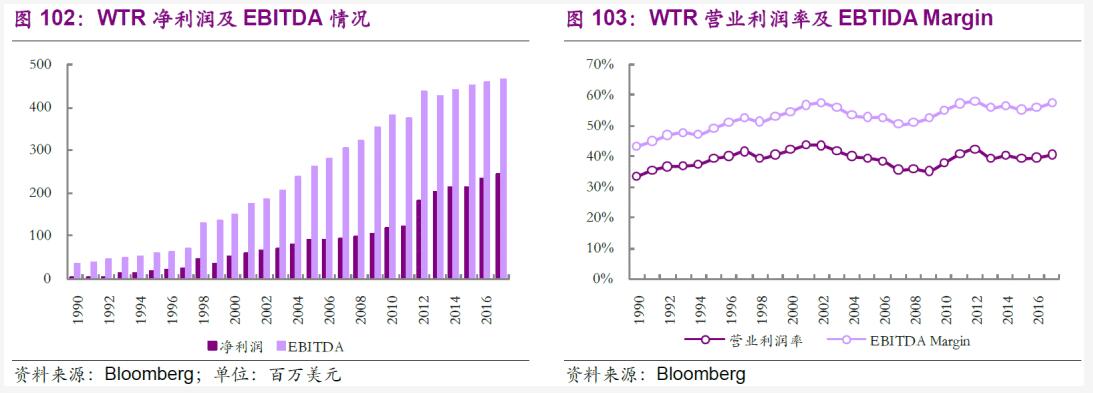 我們對(duì)WTR股價(jià)進(jìn)行了復(fù)盤(pán),為了較為明顯的展示收益特點(diǎn),我們將其分為3個(gè)階段,第一階段,公司開(kāi)始大規(guī)模的并購(gòu)且進(jìn)入收入和凈利潤(rùn)快速增長(zhǎng)期,此階段,公司較好的跑贏指數(shù);第二階段2000-2009年,公司營(yíng)業(yè)收入和凈利潤(rùn)增長(zhǎng)為2.48和1.95倍,這個(gè)階段是公司成長(zhǎng)最快的階段,股價(jià)最高峰漲幅接近3.5倍,雖然后受金融危機(jī)影響,但該過(guò)程實(shí)現(xiàn)了較多的超額收益;第三階段,由于前期股價(jià)漲幅較快公司估值并不具備優(yōu)勢(shì),雖也體現(xiàn)了水務(wù)公司的公用事業(yè)屬性,漲幅雖然較好但未跑贏指數(shù)。