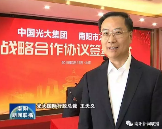 光大國際行政總裁 王天義:河南是我們很重要的戰(zhàn)略投資地。我們覺得南陽又是中國河南地級市當(dāng)中最大的市,是個(gè)人口大市、經(jīng)濟(jì)大市,也是一個(gè)環(huán)保大市。所以我們想通過集團(tuán)與南陽市政府戰(zhàn)略合作,全面推進(jìn)我們光大國際環(huán)保產(chǎn)業(yè)跟南陽市政府全面的合作,從垃圾焚燒發(fā)電開始切入,逐步向靜脈產(chǎn)業(yè)園,向無廢城市拓展我們的合作領(lǐng)域和空間,全面參與南陽市生態(tài)文明建設(shè)和經(jīng)濟(jì)社會的統(tǒng)籌發(fā)展。