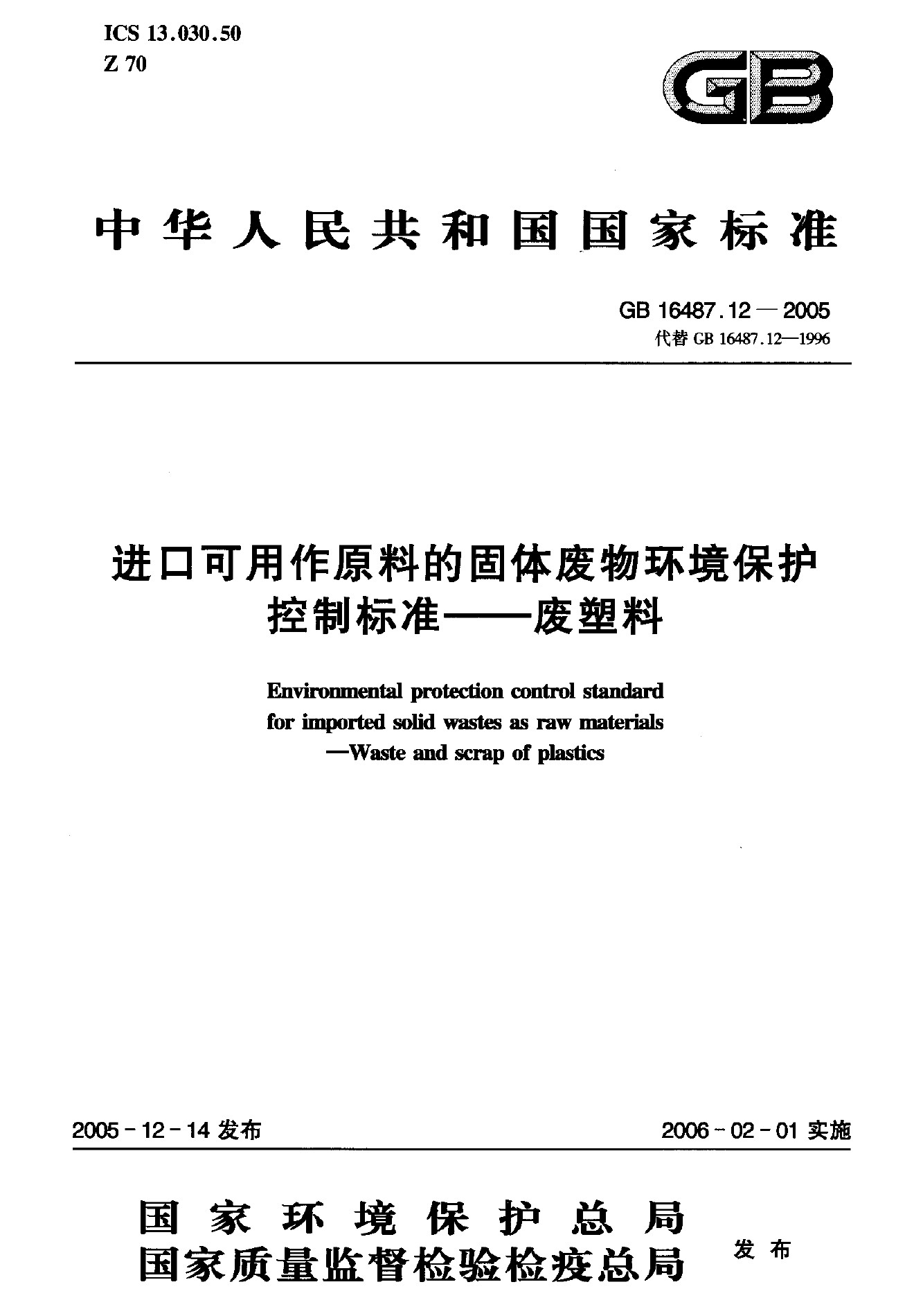 進(jìn)口可用作原料的固體廢物環(huán)境保護(hù)控制標(biāo)準(zhǔn)——廢塑料(GB 16487.12-2005)
