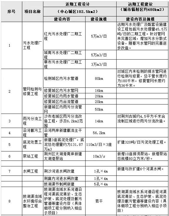 本項目考慮對近期中心城區(qū)102.5 km2 范圍予以治理,建設(shè)內(nèi)容包含沙市老城區(qū)雨污分流改造工程、沿河截污工程、中心城區(qū)管網(wǎng)檢測與修復工程、城市初期雨水調(diào)蓄及面源治理示范工程、河湖疏浚清淤及底泥處置、城區(qū)河道護岸整治、封閉湖淵活水工程、濱水景觀提升工程、中心城區(qū)智慧水務(wù)系統(tǒng)工程、中心城區(qū)水閘工程、中心城區(qū)排澇工程、河道生態(tài)修復工程、污水廠擴建工程、豉湖渠流域水環(huán)境綜合整治工程等。