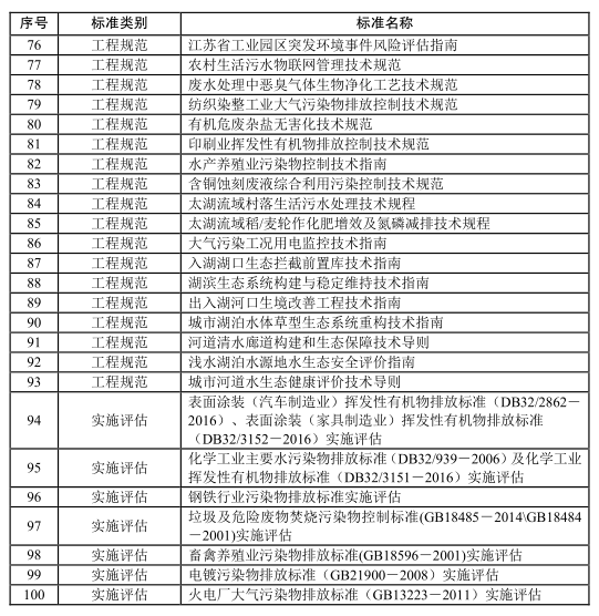 根據(jù)國(guó)家環(huán)境質(zhì)量標(biāo)準(zhǔn)體系,結(jié)合我省實(shí)際,制訂《環(huán)境空氣質(zhì)量 非甲烷總烴限值》《土壤污染物篩選值及修復(fù)目標(biāo)值》《江蘇海域海水水質(zhì)評(píng)價(jià)標(biāo)準(zhǔn)》等3項(xiàng)地方環(huán)境質(zhì)量標(biāo)準(zhǔn);制(修)訂《鉛蓄電池行業(yè)大氣污染物排放限值》《工業(yè)爐窯大氣污染物排放標(biāo)準(zhǔn)》等26項(xiàng)污染物排放標(biāo)準(zhǔn);制訂《生物中氚和碳-14的測(cè)定 液體閃爍計(jì)數(shù)法》《水中鉛-210的測(cè)定 冠醚樹脂色層法》等11項(xiàng)監(jiān)測(cè)規(guī)范;制訂《企業(yè)(污染源)全過程環(huán)境管理規(guī)范》《廢線路板綜合利用污染控制技術(shù)規(guī)范》等24項(xiàng)管理規(guī)范;制訂《污染源自動(dòng)監(jiān)控系統(tǒng)數(shù)據(jù)傳輸擴(kuò)展標(biāo)準(zhǔn)》《江蘇省太湖流域水生態(tài)健康評(píng)估技術(shù)方法》等29項(xiàng)工程技術(shù)規(guī)范;開展對(duì)江蘇省《表面涂裝(汽車制造業(yè))揮發(fā)性有機(jī)物排放標(biāo)準(zhǔn)》《表面涂裝(家具制造業(yè))揮發(fā)性有機(jī)物排放標(biāo)準(zhǔn)》等7項(xiàng)標(biāo)準(zhǔn)的實(shí)施評(píng)估。
