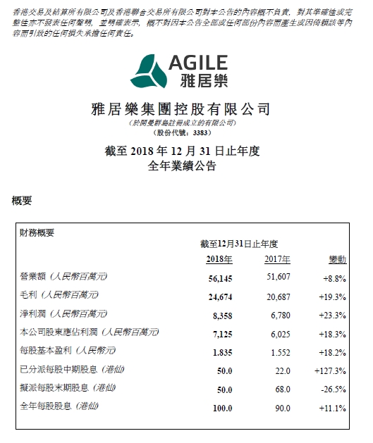 截至2018年12月31日,雅居樂(lè)營(yíng)業(yè)額及毛利分別為人民幣561.45億元及人民幣246.74億元,較去年分別增加8.8%及19.3%。凈利潤(rùn)為人民幣83.58億元,較去年上升23.3%。股東應(yīng)占利潤(rùn)為人民幣71.25億元,較去年增加18.3%。整體毛利率及凈利潤(rùn)率分別為43.9%及14.9%,較去年分別上升3.8個(gè)百分點(diǎn)及1.8個(gè)百分點(diǎn)。