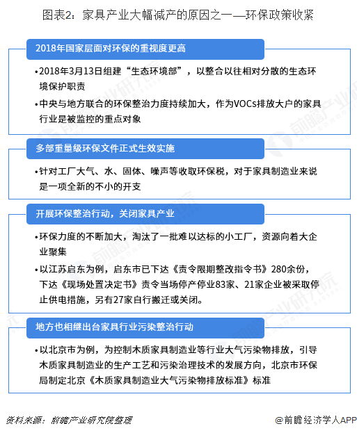 2018年家具產(chǎn)量大幅減產(chǎn)的原因之一是環(huán)保政策的陸續(xù)出臺。環(huán)保政策的收緊,國家及地區(qū)對木質(zhì)家具企業(yè)的污染問題、甲醛問題等陸續(xù)進(jìn)入進(jìn)入整治階段,中小家具企業(yè)陸續(xù)倒閉,家具行業(yè)數(shù)量減少,導(dǎo)致全國總產(chǎn)量減少。