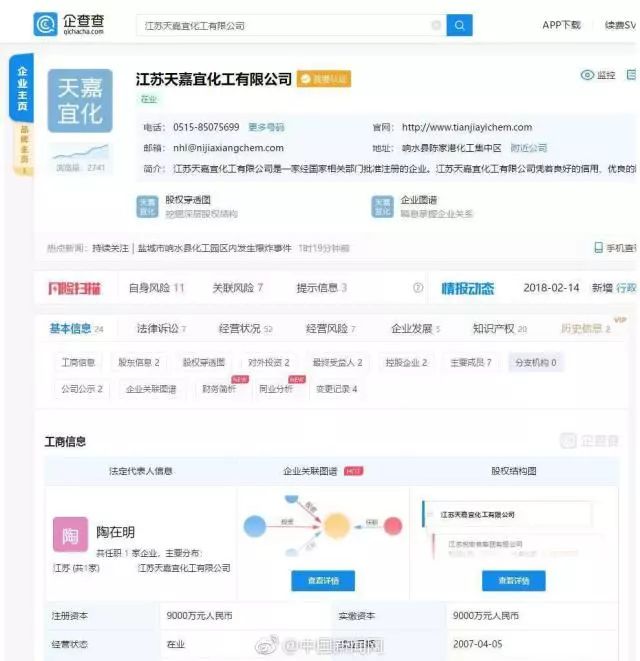 企查查數(shù)據(jù)顯示:江蘇天嘉宜化工有限公司成立于2007年,陶在明任法定代表人,注冊資本9000萬人民幣,經(jīng)營范圍包括間羥基苯甲酸、苯甲醚、KSS等精細(xì)化工產(chǎn)品制造、化工產(chǎn)品銷售等業(yè)務(wù)。