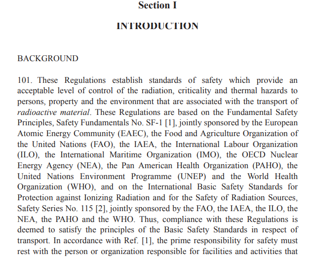 本標(biāo)準(zhǔn)規(guī)定了常規(guī)運(yùn)輸條件、正常運(yùn)輸條件和運(yùn)輸事故條件下放射性物品運(yùn)輸安全要求。本標(biāo)準(zhǔn)中的運(yùn)輸要求包括包裝的設(shè)計(jì)、制造和維護(hù),也包括貨包的準(zhǔn)備、托運(yùn)、裝載、運(yùn)載(包括中途貯存)以及貨包最終抵達(dá)地的接收和卸載。