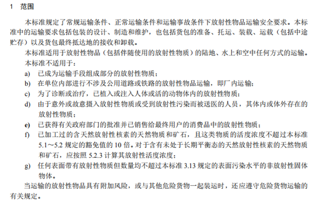 本標(biāo)準(zhǔn)適用于放射性物品(包括伴隨使用的放射性物質(zhì))的陸地、水上和空中任何方式的運(yùn)輸。