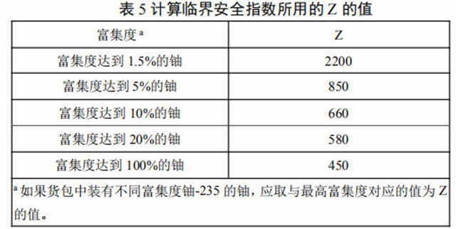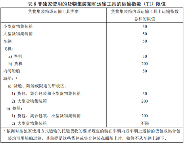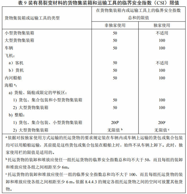 任何貨包或集合包裝的運(yùn)輸指數(shù)應(yīng)不超過(guò)10,任何貨包或集合包裝的臨界安全指數(shù)應(yīng)不超過(guò)50,按獨(dú)家使用方式運(yùn)輸?shù)耐羞\(yùn)貨物除外。
