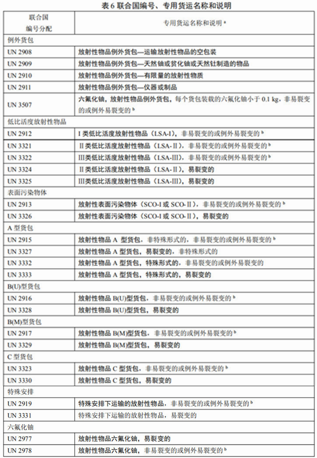 根據(jù)放射性內(nèi)容物的特性、活度水平、比活度和運(yùn)輸方式對(duì)貨包進(jìn)行分類,具體分為:例外貨包、工業(yè)貨包、A型貨包、B(U)型貨包、B(M)型貨包、C型貨包。還有易裂變材料貨包和六氟化鈾貨包。(詳見(jiàn)7.1)