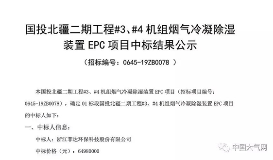 浙江菲達(dá)環(huán)??萍脊煞萦邢薰局袠?biāo)國投北疆二期工程#3、#4機(jī)組煙氣冷凝除濕裝置EPC項(xiàng)目,中標(biāo)價(jià)格為64980000元。